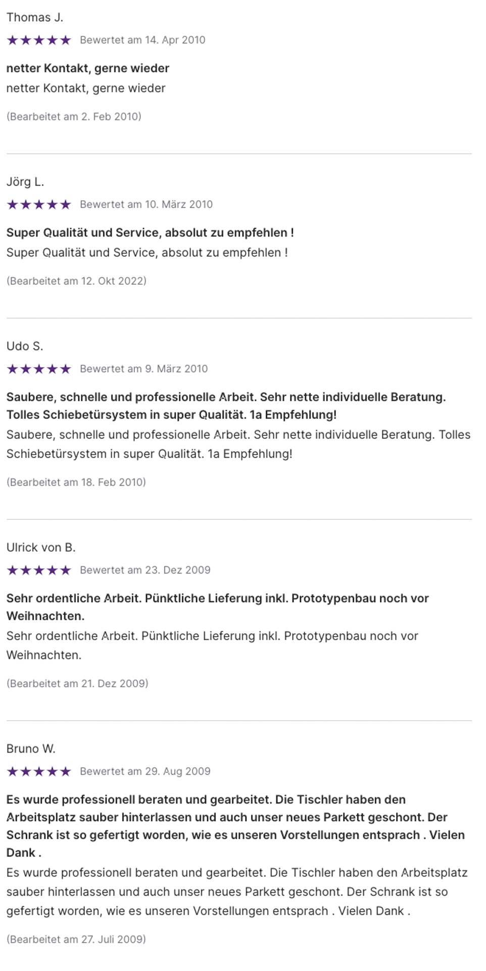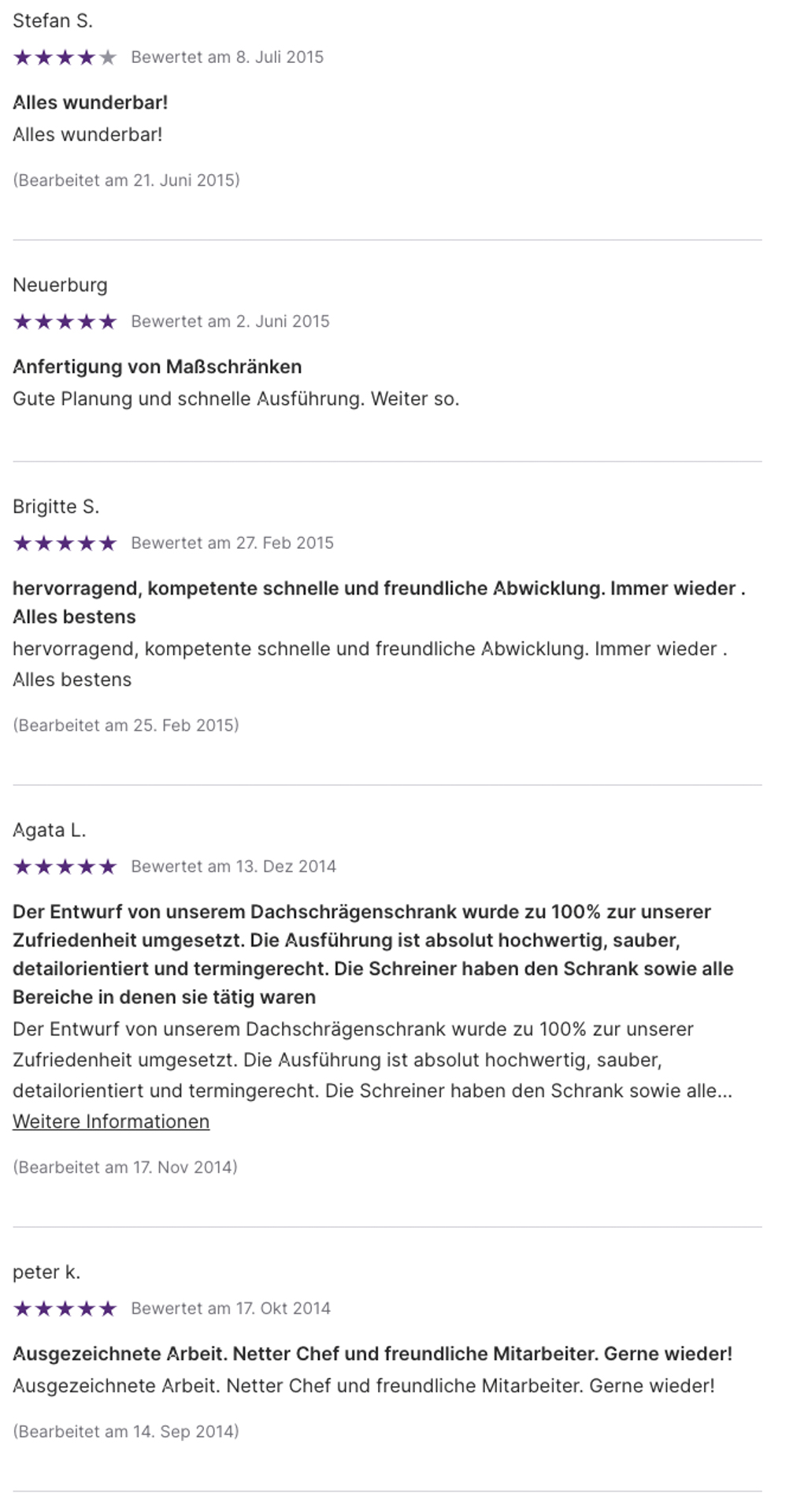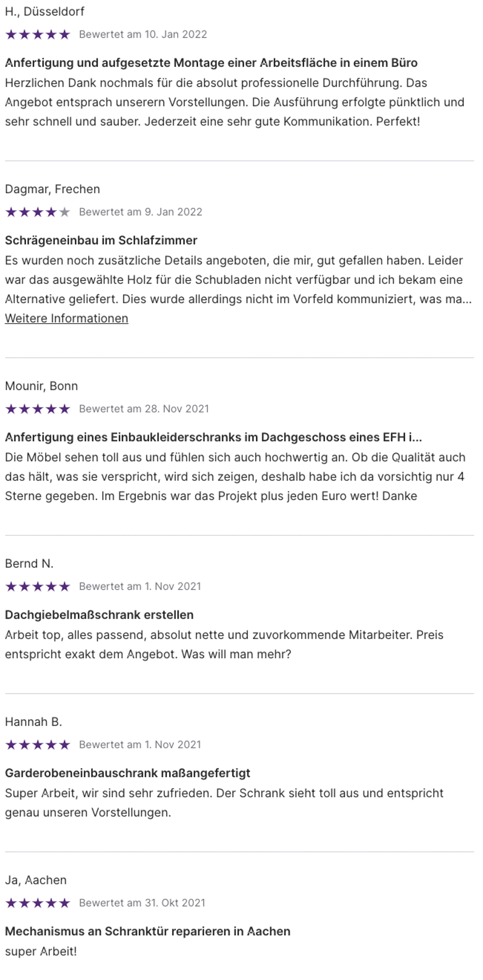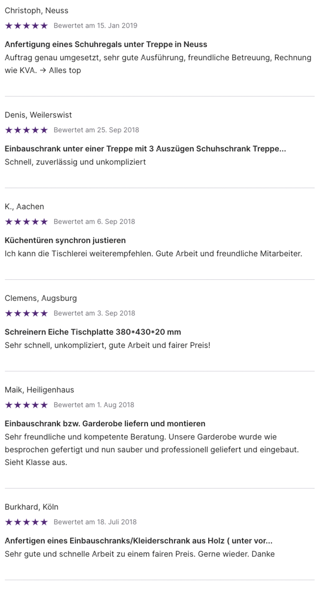 Als Schreinerei in Aachen bieten wir faire Festpreise ohne versteckte Kosten und begleiten Sie von der Beratung bis zur Montage – alles aus einer Hand. Kein Subunternehmer, keine Verzögerungen. Überzeugen Sie sich selbst von den Erfahrungen unserer Kunden.