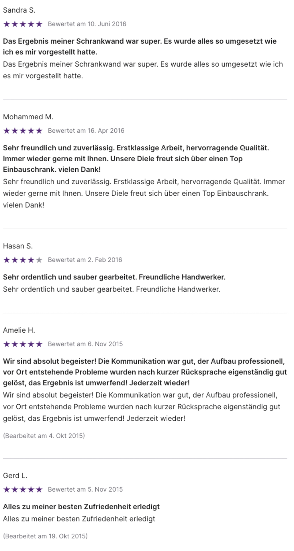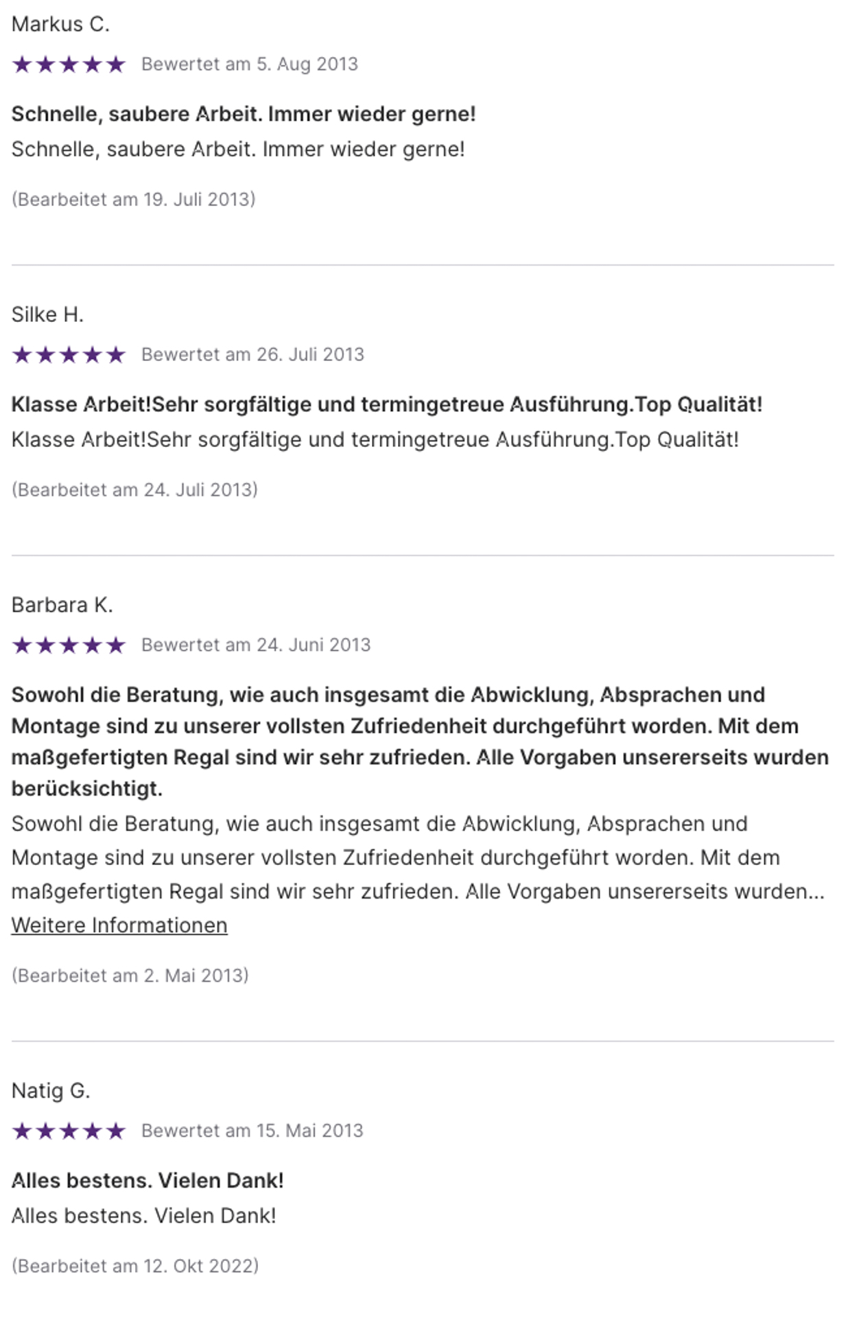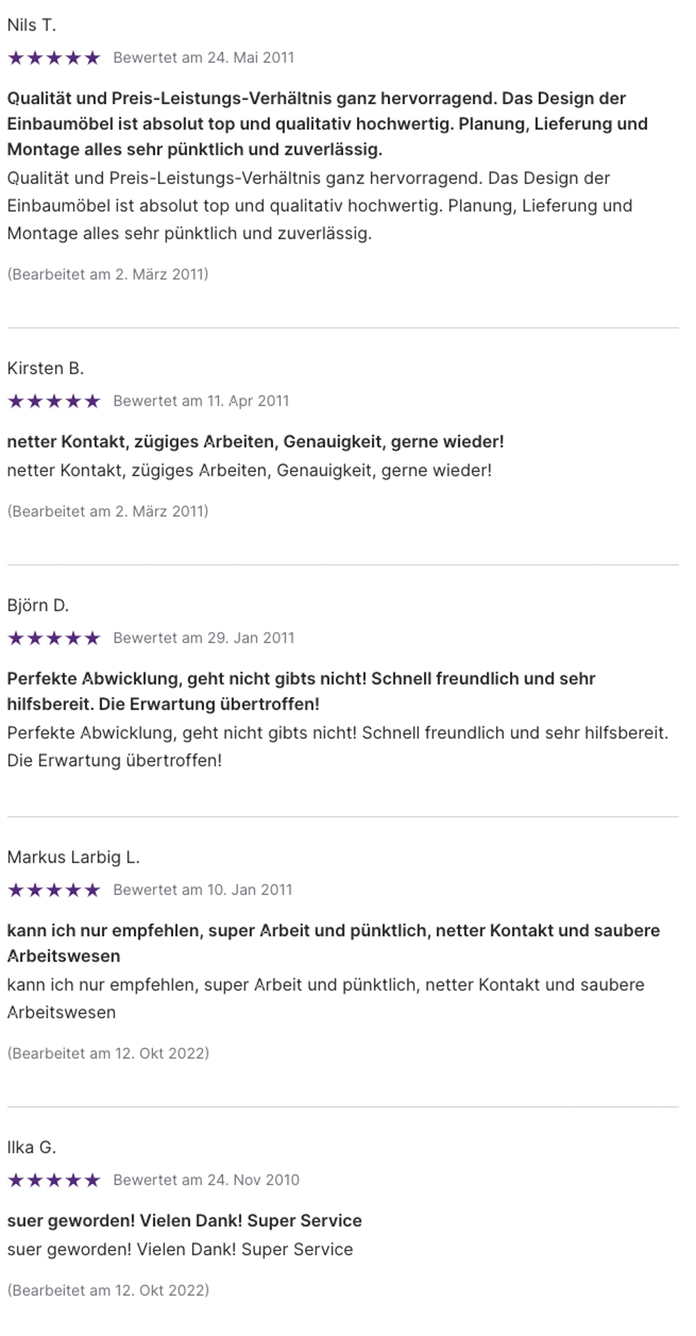 Als Schreinerei in Aachen bieten wir faire Festpreise ohne versteckte Kosten und begleiten Sie von der Beratung bis zur Montage – alles aus einer Hand. Kein Subunternehmer, keine Verzögerungen. Überzeugen Sie sich selbst von den Erfahrungen unserer Kunden.