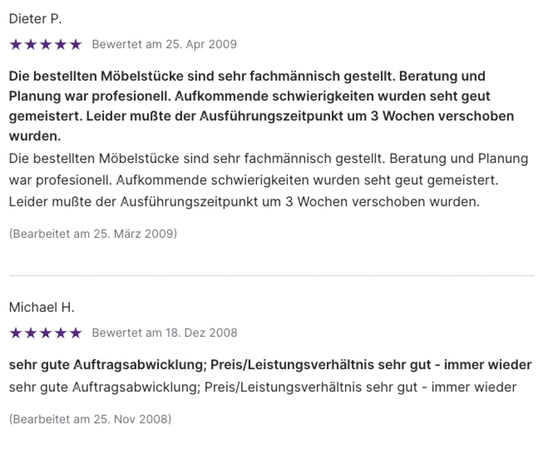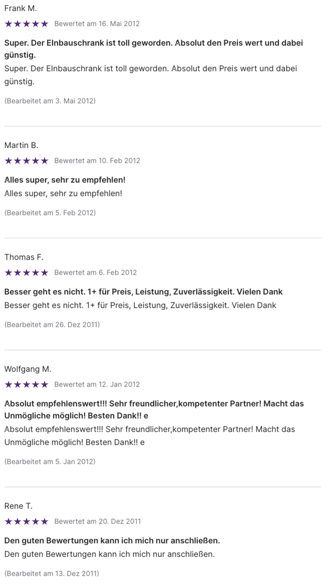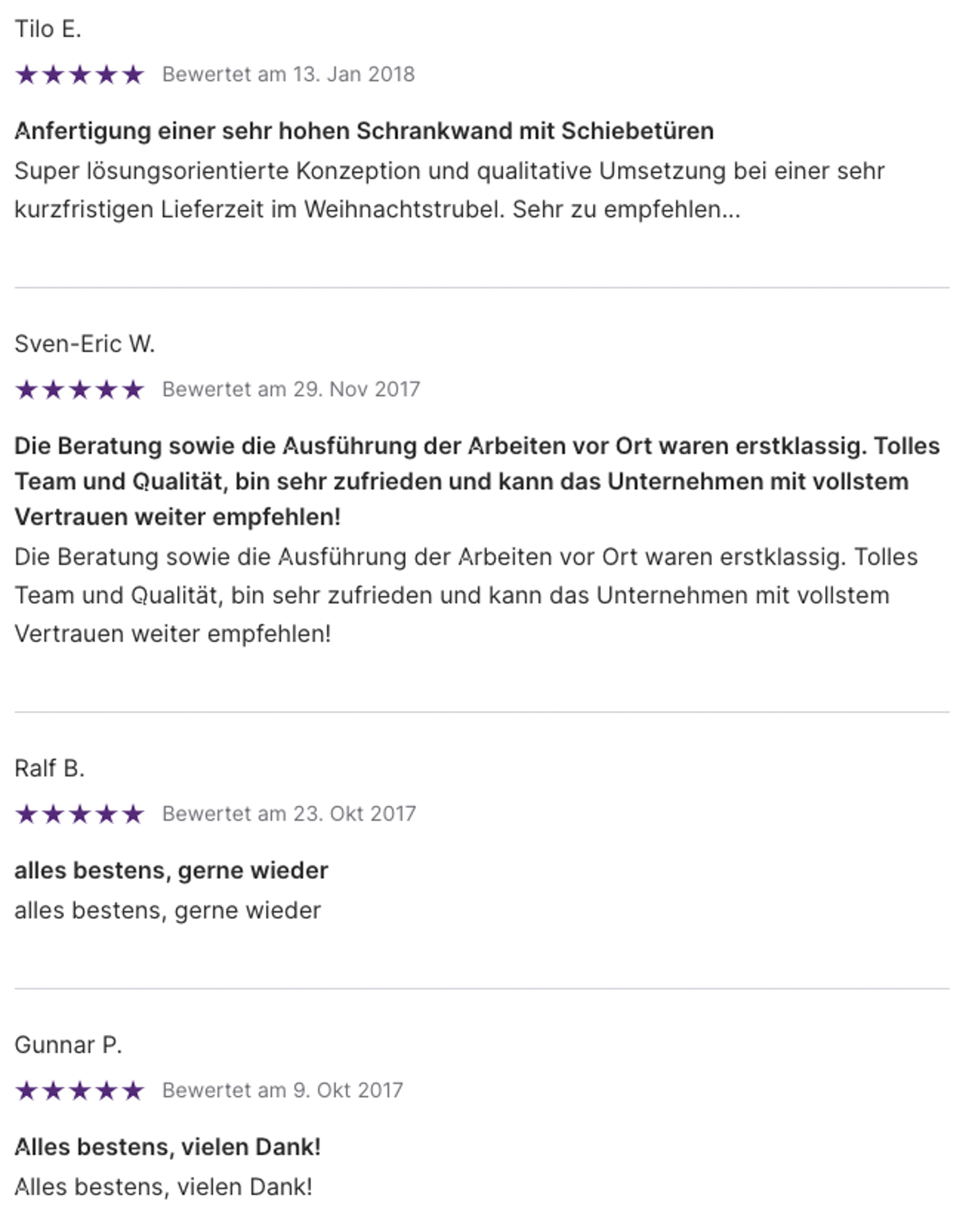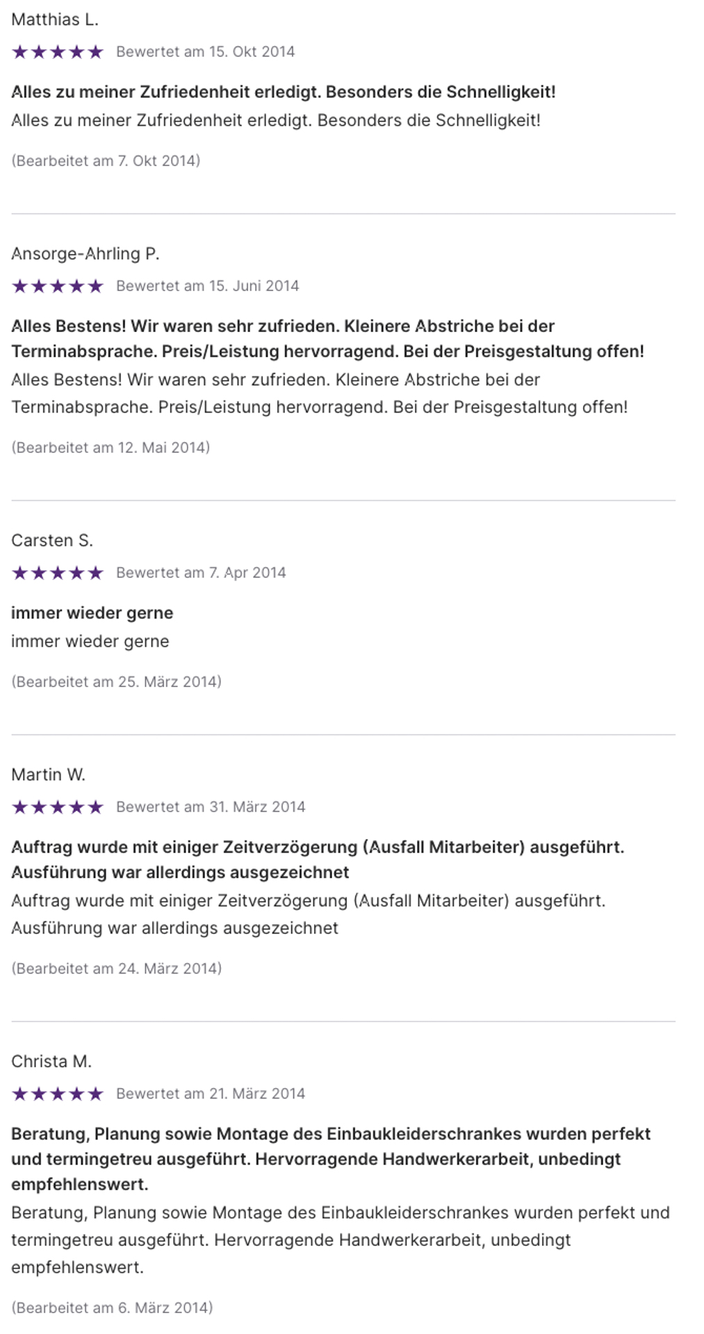 Als Schreinerei in Aachen bieten wir faire Festpreise ohne versteckte Kosten und begleiten Sie von der Beratung bis zur Montage – alles aus einer Hand. Kein Subunternehmer, keine Verzögerungen. Überzeugen Sie sich selbst von den Erfahrungen unserer Kunden.